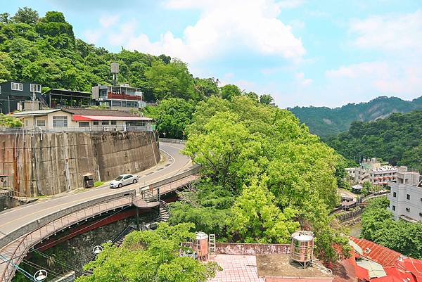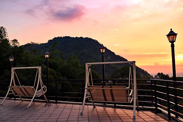 雖然衝上來頂樓沒來得及看到夕陽,不過坐在搖椅上望著山間的景致,還是頗浪漫的!如果是曖昧中的情侶來,說不定可以考慮泡湯完再一起看晚霞,然後氣氛道位的時候就來個真情告白 (?) 感覺很容易成功 XD 畢竟女生都愛漂亮、所有人都愛美景。泡澡先變漂亮 (泥漿溫泉有養顏美容的功效)、泡澡完再看風景,真是人生一大享受阿
