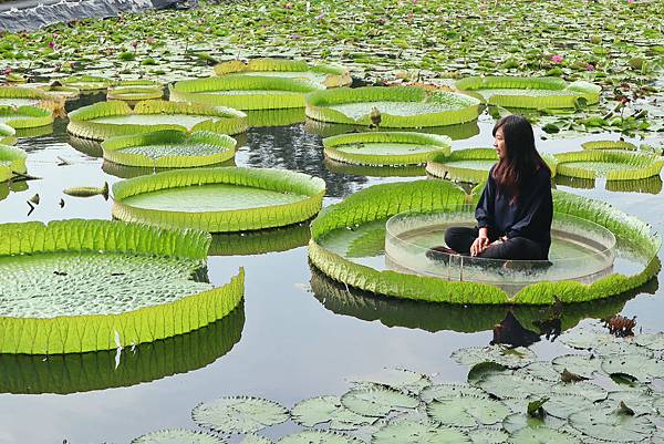 蓮花公園涼亭邊有店家,在這裡可以乘坐大王蓮,之前就看過很多朋友PO照片,一直想要嘗試看看!不過這個大王蓮只能承重60公斤,果子岌岌可危,所以就還是讓Mia上去玩就好 XD 果子負責拍照 ~ 本來以為大王蓮可以直接踩進去,真正體驗才發現原來還有一個塑膠容器,應該是這樣才能讓蓮葉受力平均不至於破掉 (話說本來以為沒有這個塑膠容器,還在想要不要玩,因為感覺有點可怕 XD)
