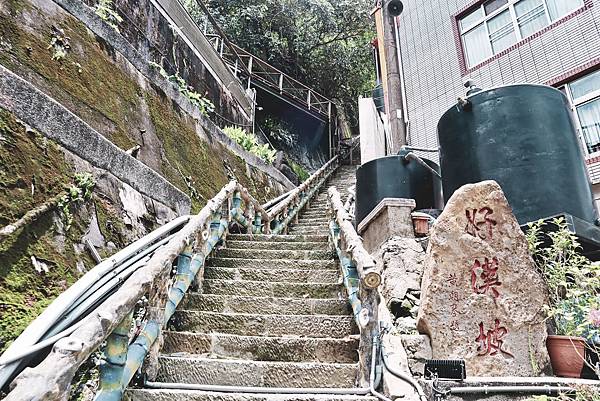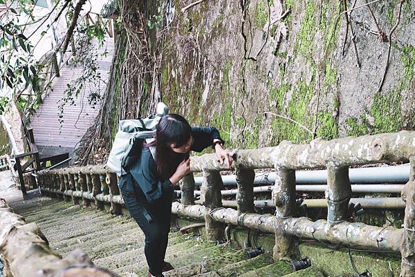 Mia 很認真的在爬好漢坡,因為咪阿怕高 ~ 大家來挑戰的時候記得不要走太快,因為石階上有滿多青苔的,慢慢走比較安全。入口處的簡介牌上寫著這個石階共有300階,果子雖然沒有認真數,不過其實走到頂往前看就會看到溫泉老街上的那家萊爾富XD 也就是說偷懶的走法就是從溫泉老街那邊走下來 哈哈