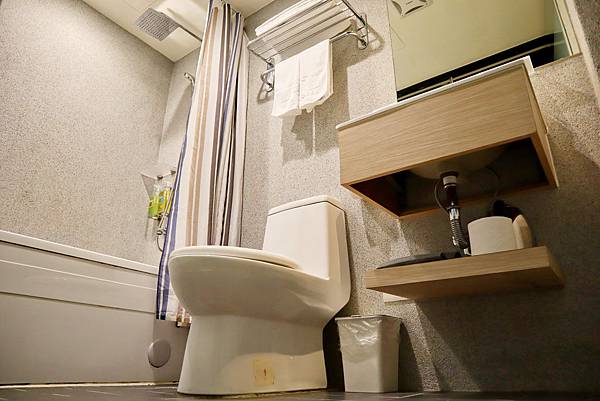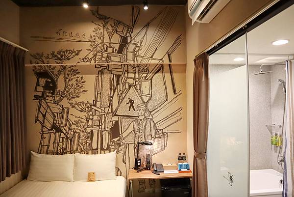 町記憶旅店房間,以台北的房間來說並不會太小,靠牆的雙人床距離浴室還有約一公尺的空間,同時有果子最喜歡的小書桌可以做事、傳照片、備份資料等等;浴室非常明亮也乾淨