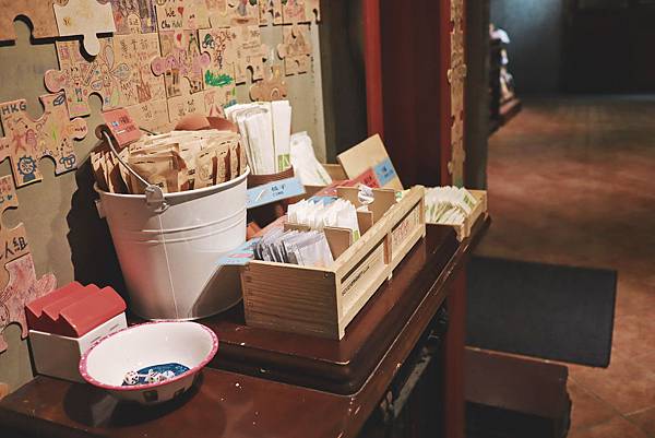 辦理Check in時,會收到一份小禮物,這份禮物包裝著房卡。這大概是果子目前住過最有創意、有質感的房卡。這個小禮物盒本身,只要把它沿著線剪開就是兩張精緻的明信片、裡面除了房卡之外,還有兩張早餐咖啡抵扣券、町記憶旅店的書籤、一份手繪地圖 (老闆很可愛的說不要照著地圖走,會迷路 XD)、還有一塊傳承記憶與故事的拼圖,大家可以在這塊拼圖上寫下自己來到台北這趟旅行的種種,然後貼在拼圖牆上成為町記憶旅店中永遠記憶的一部分