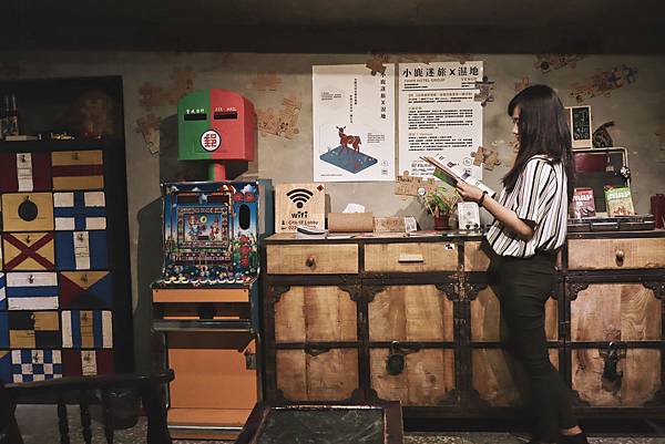大廳一隅,渾然天成的復古感,老櫃旁放有許多DM以及旅遊的簡介