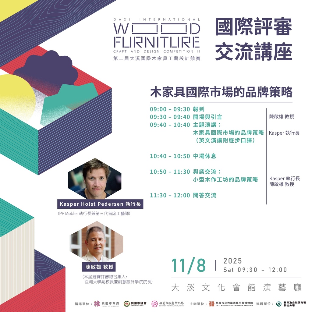 此外,2025 年 11 月 8 日 (六) 上午,在桃園大溪木藝生態博物館還會有「第二屆大溪國際木傢俱工藝設計競賽 - 國際評審交流講座 II」。由本屆競賽評審總召、亞洲大學副校長 陳啟雄 教授主持開場,邀請來自丹麥 PP Møbler 品牌的執行長 Kasper Holst Pedersen 主講。講座主題為「木傢俱國際市場的品牌策略」,以英文演講並提供同步口譯。Kasper 將分享 PP Møbler 在全球市場的發展經驗,談品牌如何在堅持手工與永續理念的同時,仍保持現代設計的靈活度。中場短暫休息後,陳啟雄 教授會繼續與 Kasper 將以「小型木作工坊的品牌策略」為題展開對談,延伸探討在地工藝如何與國際品牌精神對話,非常值得這個周末來訪的旅客一起來共襄盛舉!